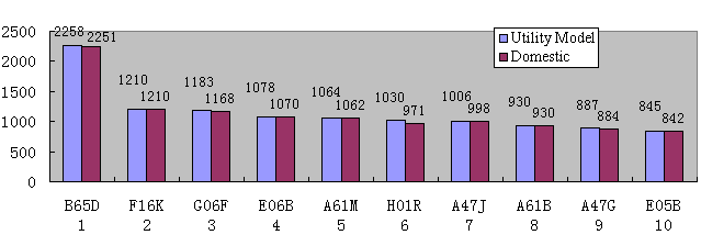 Among the top ten IPC groups, 5 are the same as those in the top ten IPC groups according to the accumulated number of issued patent for national inventions, and the only difference is their ranking positions. This shows that, in some areas, the development of the national technologies is basically more or less in compliance with international trend, though not in the same pace.